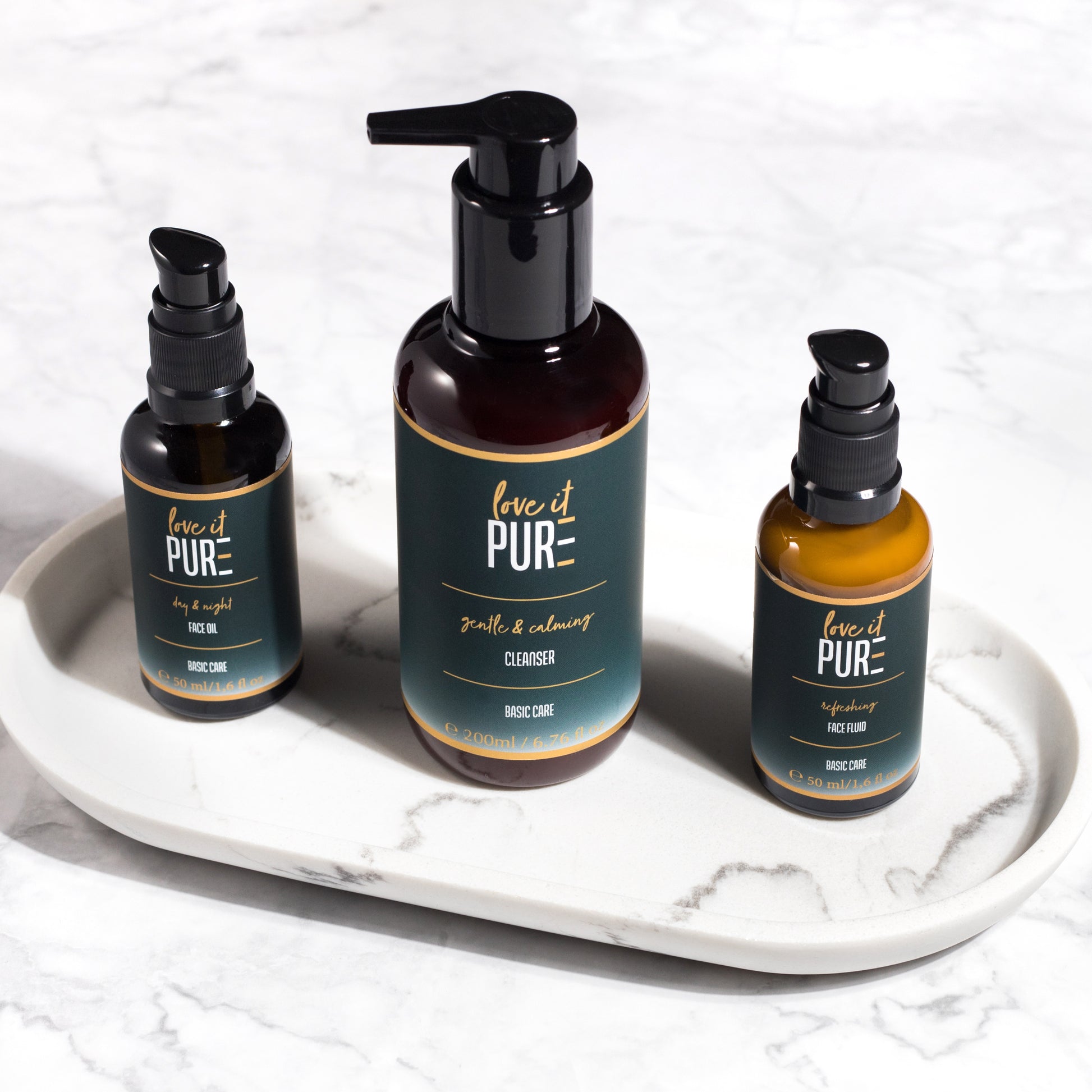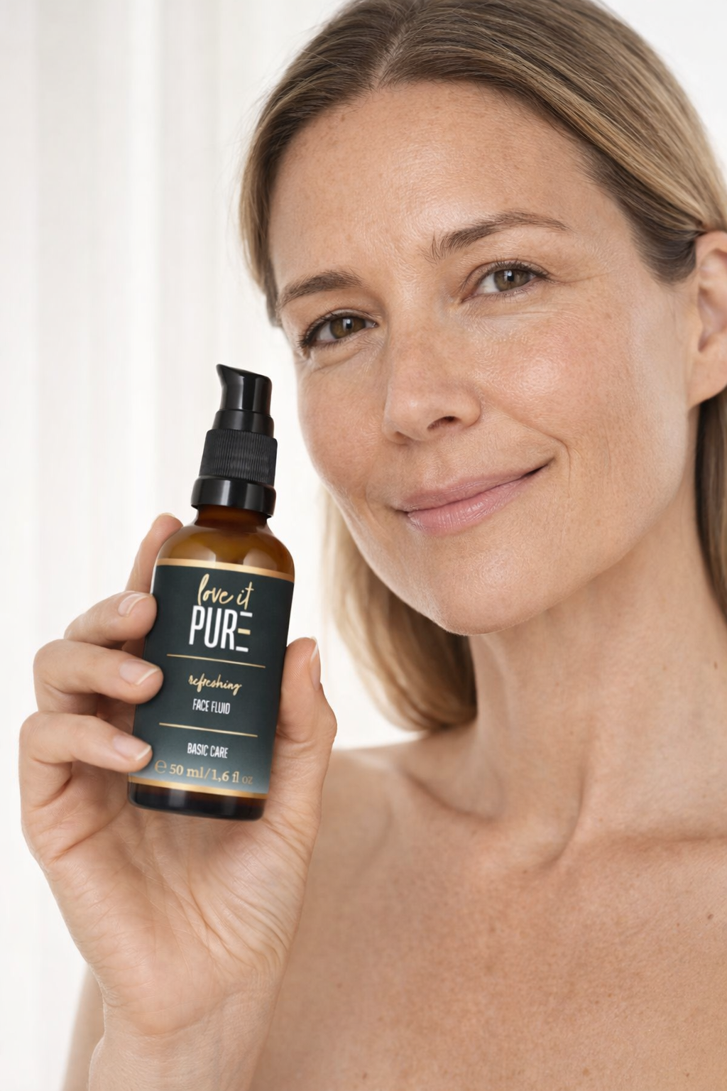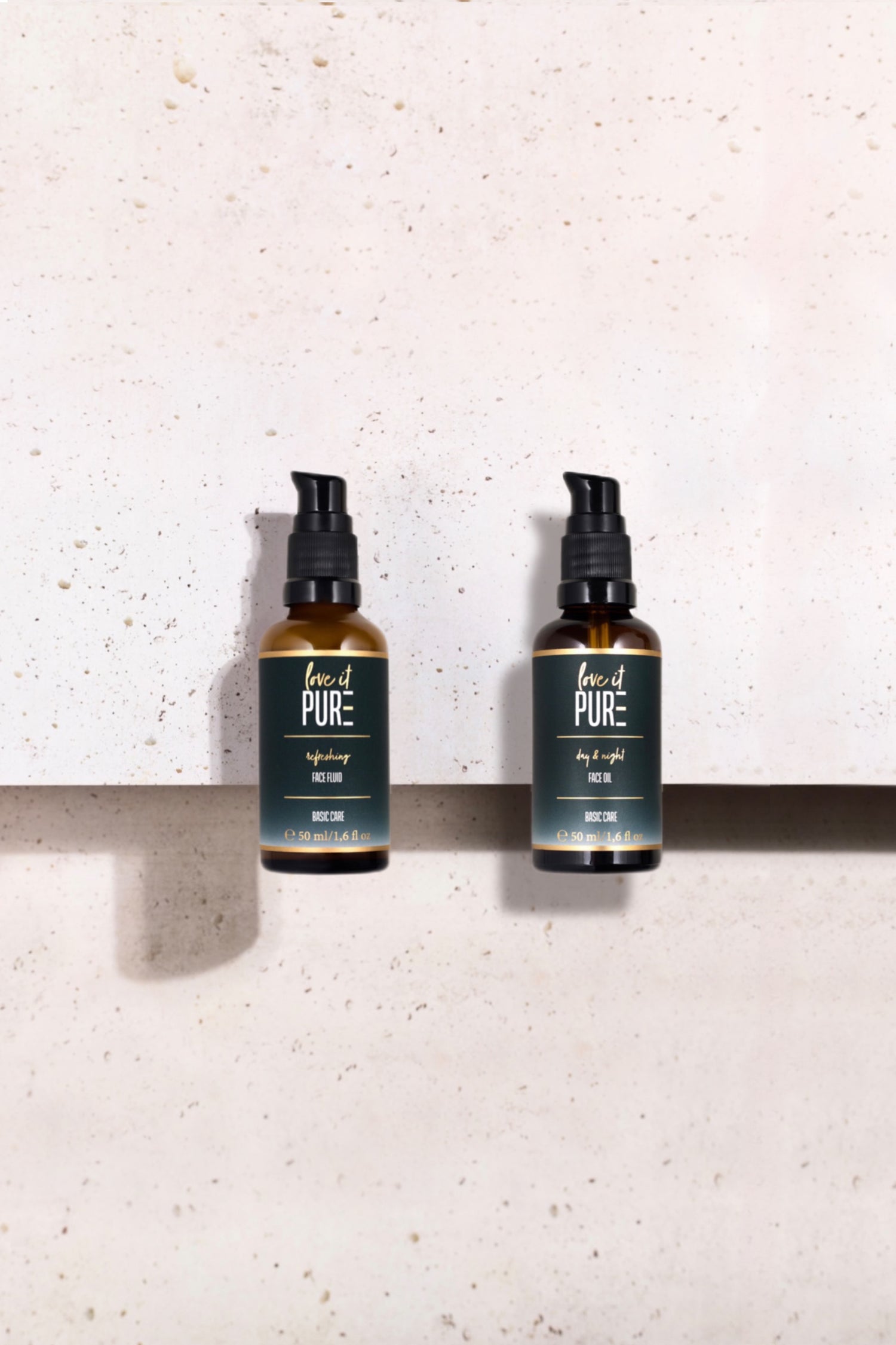 Die Basic Care ist der Einstieg in das Love it Pure Hautpflegesystem und bleibt dauerhaft dein stabiler Rahmen. Sie ist keine einzelne Creme mit festgelegter Rezeptur, sondern ein strukturiertes System aus Reinigung, Feuchtigkeitsphase und Lipidphase, das sich flexibel an dein aktuelles Hautbedürfnis anpassen lässt. Während herkömmliche Pflege Feuchtigkeit und Lipide in einer starren Formulierung verbindet, trennt Love it Pure beide Komponenten bewusst. So kannst du das Verhältnis von Refreshing Face Fluid und Day & Night Face Oil jederzeit individuell steuern – ohne das Produkt zu wechseln. Die Struktur bleibt. Die Dosierung passt sich an.