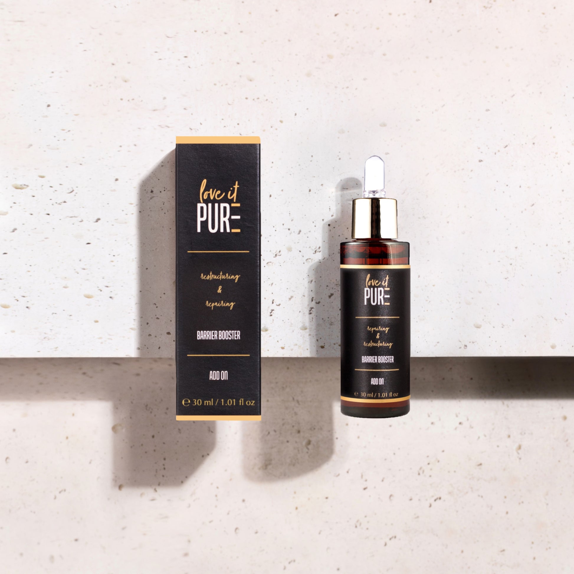 Der Barrier Booster ist als Add On im Love it Pure Hautpflegesystem dafür entwickelt, die Basic Care Routine gezielt zu ergänzen, wenn die Hautbarriere genau diese zusätzliche Unterstützung braucht. Die Basic Care bleibt die feste Basis deiner täglichen Hautpflege. Der Barrier Booster kommt gezielt hinzu, wenn die Hautbarriere mehr Unterstützung braucht. Er ist deine flüssige Hautschutzbarriere im Flakon, repariert und restrukturiert deine Haut. Eine intakte Hautbarriere ist essenziell für eine schöne, gesunde Haut.